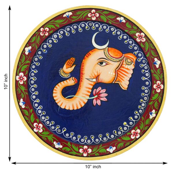 This hand-painted pichwai wall plate features Ganesha, the Hindu god of wisdom and prosperity. He is depicted with a flower on a blue plate, surrounded by flowers and a horse. The intricate details and vibrant colors make this a beautiful piece of art for any home.